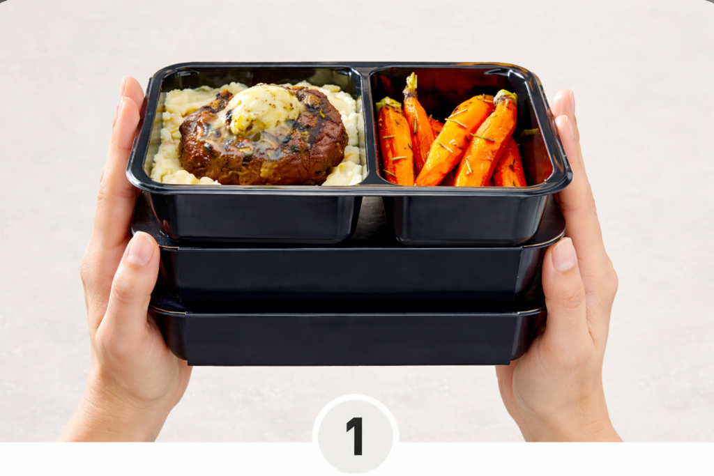 Tus viandas fresca llegan en una caja reciclable con aislación térmica. No tenes que cocinar ni lavar: solo calentá y disfrutá.