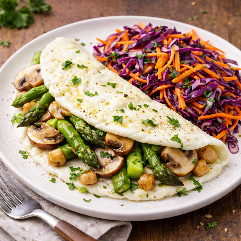 Omelette de Claras con Espárragos y Champiñones + Ensalada de Repollo Morado y Zanahoria